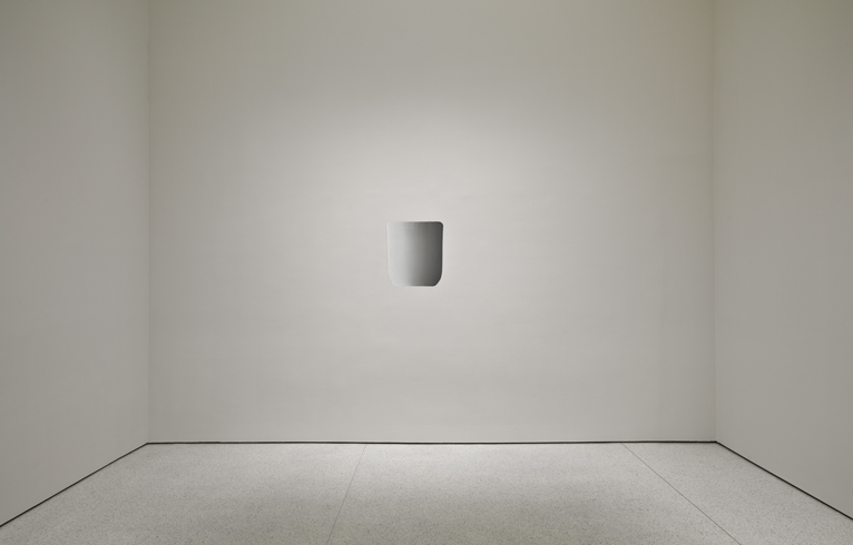 Lee Ufan was the best-known practitioner and prime theoretician of the loosely organized and short-lived (1968-1972) “Mono-ha” (often translated as “School of Things”), a collective for whom the aesthetic notion of “encounter” as a phenomenological event figures prominently. For this exhibition, the now 75-year-old Lee reenacted his Mono-ha period staple Phenomenon (1968), lifting a brawny boulder to crack a thin glass sheet lying atop a commensurately sized steel plate. In this “controlled accident” mediated by Lee, fundamentally different materials—industrial versus natural, taken as they are yet not readymades—exist in a peculiar, dynamic relationship of “things” that extend to include their environs and the audience. Heavily influenced by the phenomenologist Maurice Merleau-Ponty, one of Lee’s heroes while studying at Nihon University, Lee’s sculptural oeuvre—retroactively titled Relatum—also vividly evokes elements of Zen, from the spiritual notion of sudden enlightenment, to the topological articulation of Zen garden arrangements. Throughout the ramps and ancillary galleries, assortments of stones rigorously hand-picked by the artist at a Long Island quarry do things. Some meditate by opposing a slanting steel plate; others distort a scaled stripe and by extension its encoded system of measurement, or rest en masse atop soft cushions. Works involving steel plates, flat or elegantly bent, inevitably recall Richard Sera, minus the overwhelming physicality.
