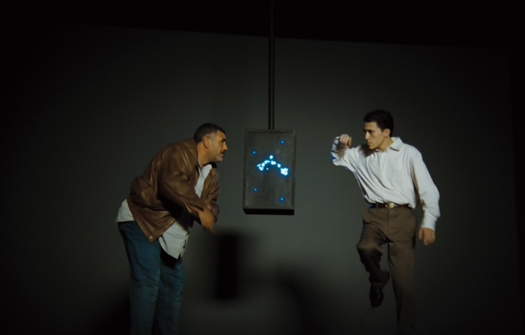 在二楼,开罗艺术家哈桑·汗的2010年影像作品《珠宝》引人驻足,伴以艺术家本人创作的有高度感染力的沙比音乐(一种在开罗广受欢迎的将传统乐器和电子乐结合的门类),影像一开场时以近镜头表现了一条闪闪发光的琵琶鱼,后来才知道原来是缓慢旋转的迪斯科球上的蓝色霓虹影像。随着镜头慢慢远离,我们看到两个人物,一个穿着皮夹克和牛仔裤的矮胖中年男人,和一个穿白衬衫和卡其裤的瘦削男孩,他们居然在一个让人难以置信的黑匣子里跳着舞。随着二人同时转换舞步,发生互动,镜头也越拉越近,在这场看似无限的舞蹈中,二者之间永恒的距离似乎是对任何性质的关系中难以言说的幽微之处的一个生动比喻。再因为具体的互动以及现实生活中常见的阶级和权力斗争,使这部作品具有强烈的、诱人的、难以置信的能量,使众多观众久久驻足。