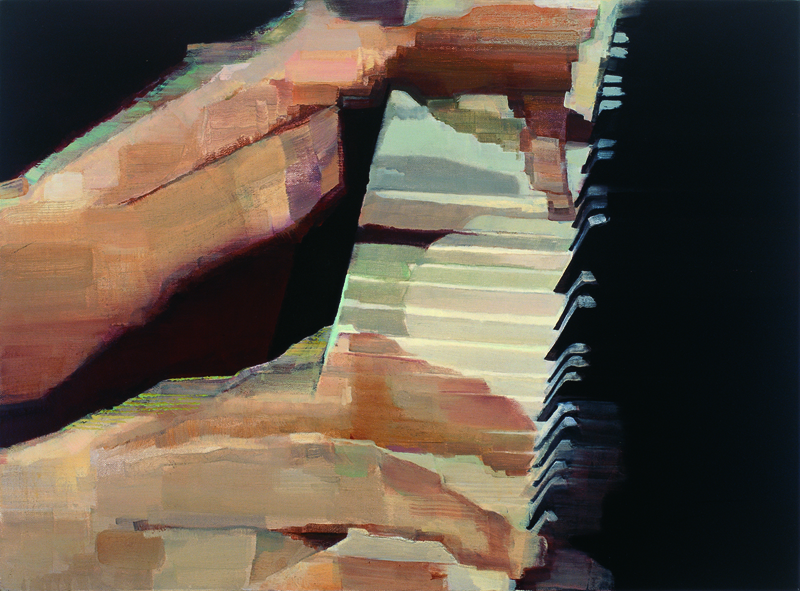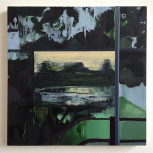 相较2010-2011年间那些用鲜明冷色调处理,光线幽微奇特的室内空间—如影院、剧场、乐队排练现场,最近的画面则看起来更为晦涩.画中景观往往造成困惑,却又毫不陌生.韩冰曾引用Gerhard Richter 1973年在访谈中对风景的阐释: “landscape is simply inhuman, and all the rest is simply projection.”(风景并无人情,其余的一切仅仅是投射.)十九世纪浪漫主义艺术迷恋自然景物莫测而非理性的力量,而当下的景观—糅杂建筑、自然碎片、城市构架的风景所激发想象的则属于社会心理,幽闭而瑰丽.