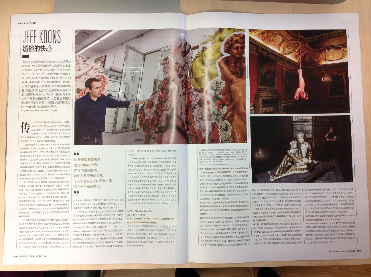 Koons在谈及自己作品,即便是商业合作时,通常有种出人意料的坦诚态度:目光直视听众,又像推销员,又像布道者,又像美术史教授那样娓娓诠释—比如一件黄铜色气球兔子双耳的角度如何源自古埃及皇后Nefertiti的前额,比如气球玩具自身膨胀的紧张感如何让身处气球之外世界的观众感到安全,或是他如何欣赏古希腊最重要雕塑家之一Praxiteles(虽然他发错了音)。时刻留意每位听众的反应,不带一点焦虑或是愤世嫉俗。接下来的大半年他将投入紧张筹划2014年在惠特尼美术馆的回顾展,这是惠特尼从上东区著名的Breuer大楼搬到下城新址之前的最后一个展览,旨在最全面地展现他争议不断的艺术生涯。Jeff Koons这种自己心知肚明、美国白人式的、病态的乐观,也许依然有着广大的受众。