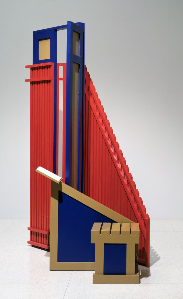 Between 1974 and 1975, Armajani created a series of small sculptures collectively titled Dictionary for Building. Taking note of the modest yet striking forms of vernacular structures – from stairs down the basement to loading docks – on a trip across the United States, Armajani composed a ‘travelogue’ that explored both a culturally codified architectural language and the social, even fictional spheres it mobilises. Incisive yet playful, specific yet highly abstract, Armajani’s reinterpretations of these structures are created through the ingenious use of equally modest materials, such as cardboard and woodchips. The artist presents us with not only humble yet potent monuments, but his processing of their significance and dignity; guided by that process, we become mindful of not only what we see, but also what becomes revealed in our newly found ways of seeing.